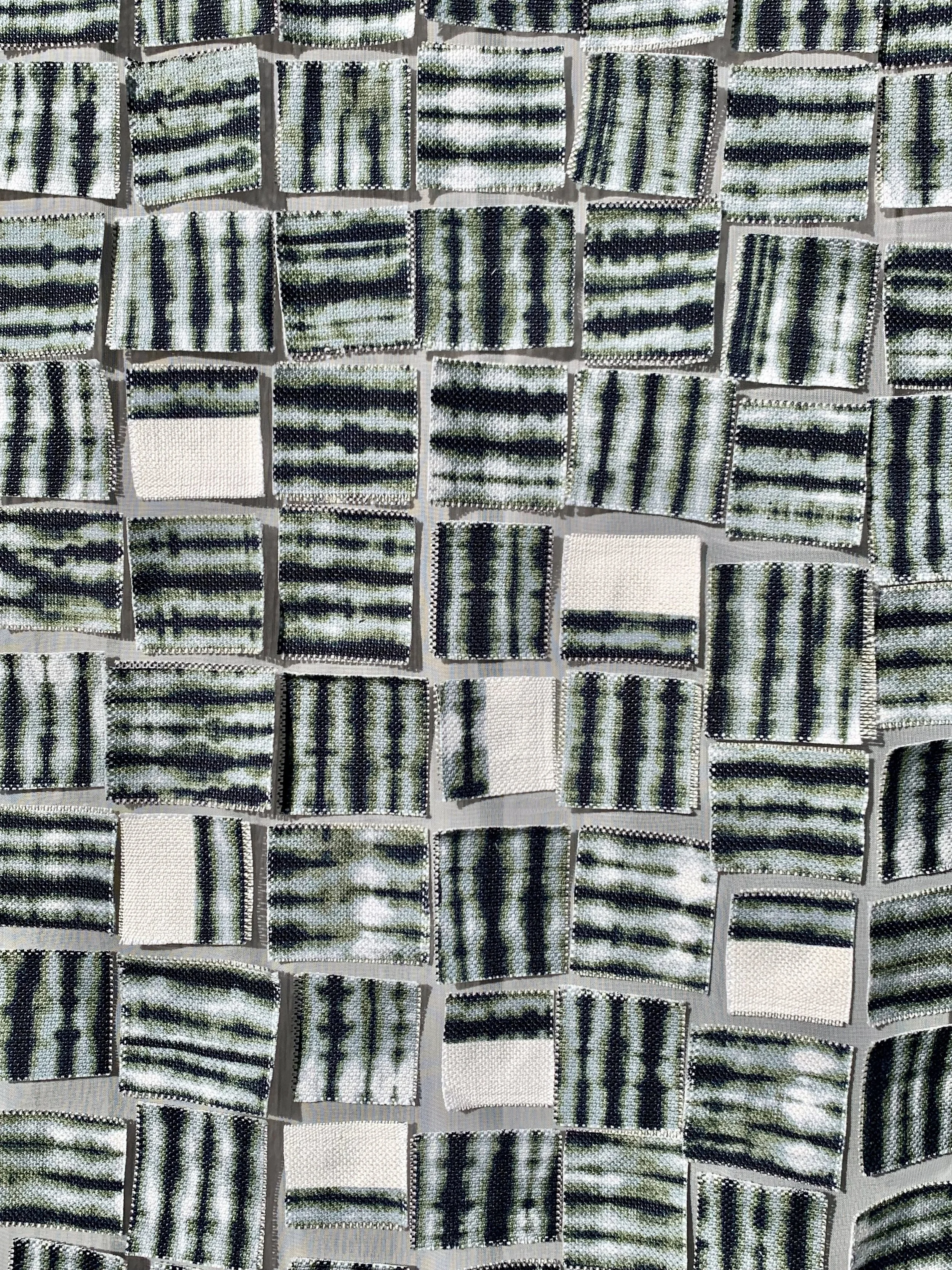 A collage of hand-cut textile fragments hovers on a sheer surface, each square carrying its own quiet rhythm. Subtle shifts in line and shade form a living pattern that changes with the light—an interplay of repetition, movement, and delicate imperfection.